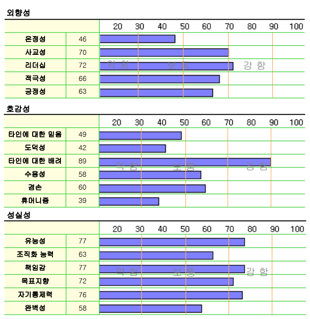 - 야망과 성취욕이 대단하게 나왔다. 리더십도 장난 아님. 실력은 말해 무엇? 조직화 능력도 꽤 높게 나왔다. 역시 대기업 임원진상인가..(자뻑 대단하지만 팩트임)