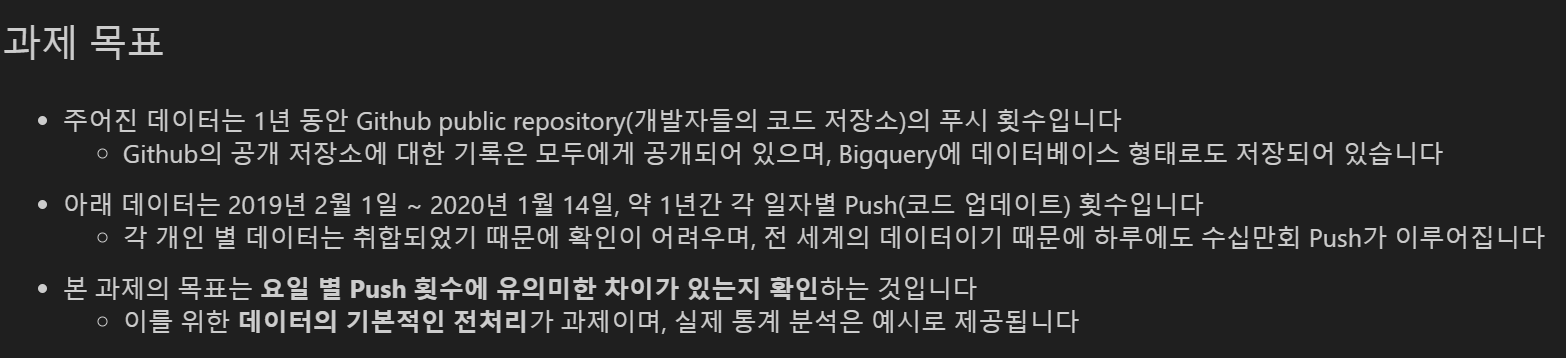 - 3번 문제까지가 필수 python 과제라 풀었지만, 4번 문제부터 옵션 문제였다. 눈이 돌아가는 기초 통계였는데 무슨 소리인지 1도 모르겠어서 쿨하게 제출했다. 주말 동안 기초 통계 강의 들으면서 무슨 소리인지 한 번 봐야겠다.