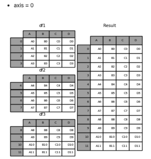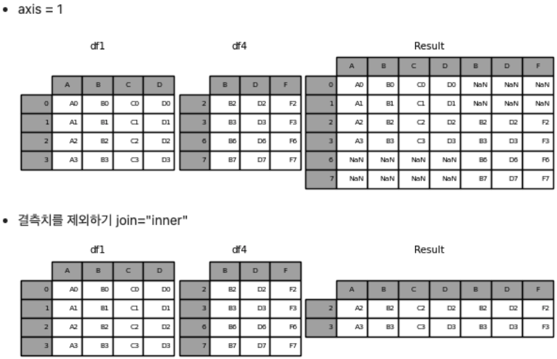 기본값은 0 => 위아래로 연결하는 경우 해당 / 1로 설정 => 좌우로 연결 - ignore_index: 연결된 데이터프레임의 인덱스 설정