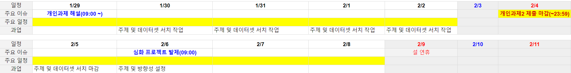 - 현재 데이터셋 및 주제 설정 단계로, 데이터셋 서치에 집중하는 기간이다.
