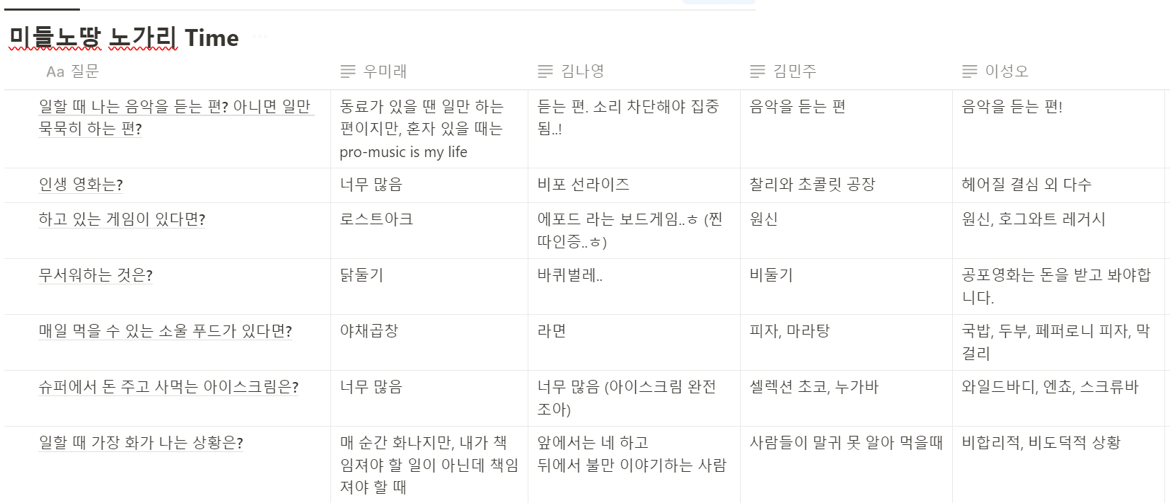- 평균 연령 만 28세의 팀입니다. 스파르타코딩클럽에서는 완전히 노땅은 아니지만, 약간 노땅인 ‘미들노땅’팀입니다. 저희 팀은 MBTI 속성이 ‘TP’입니다. 일정 알람 봇 매우 필요합니다.